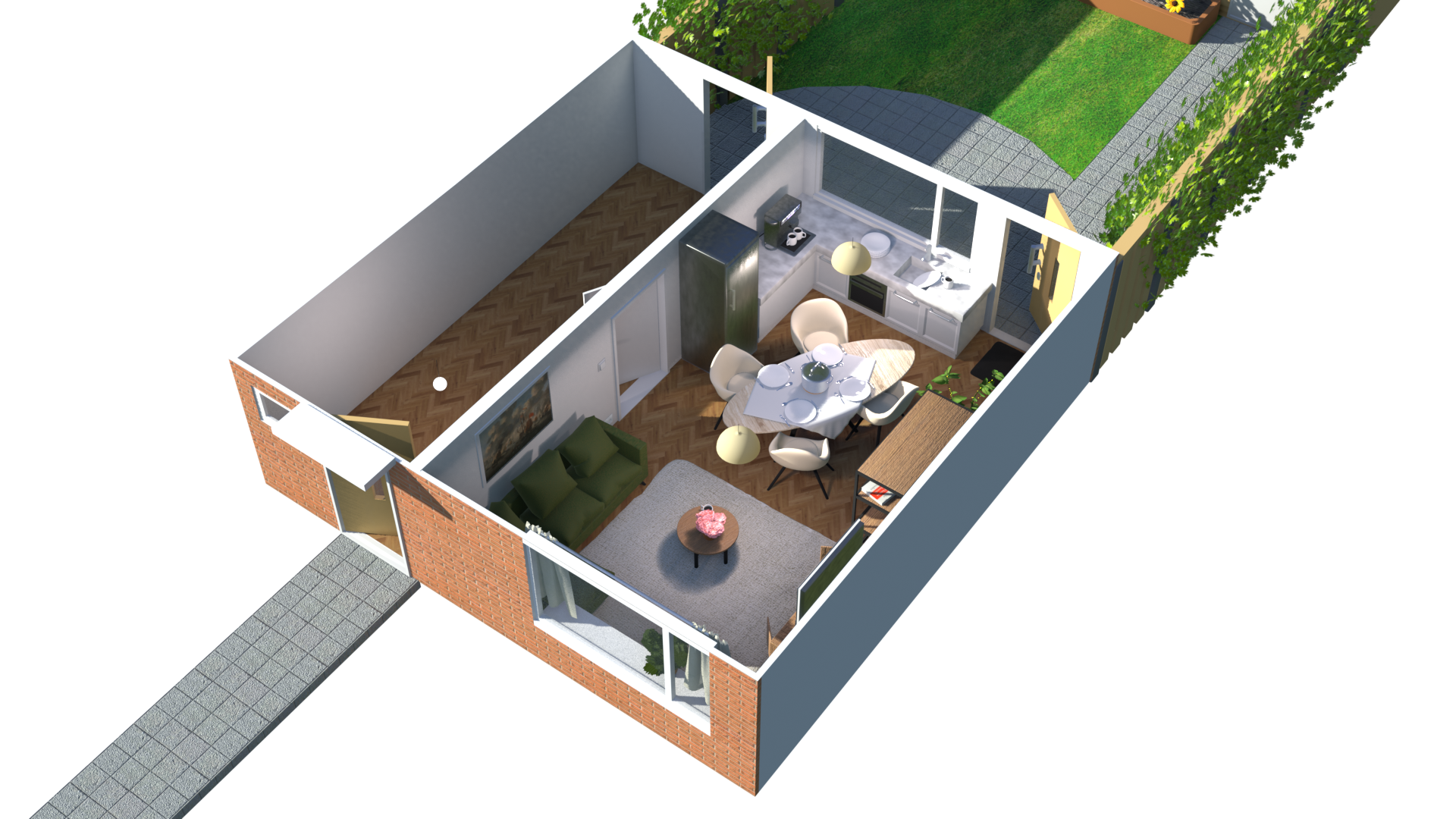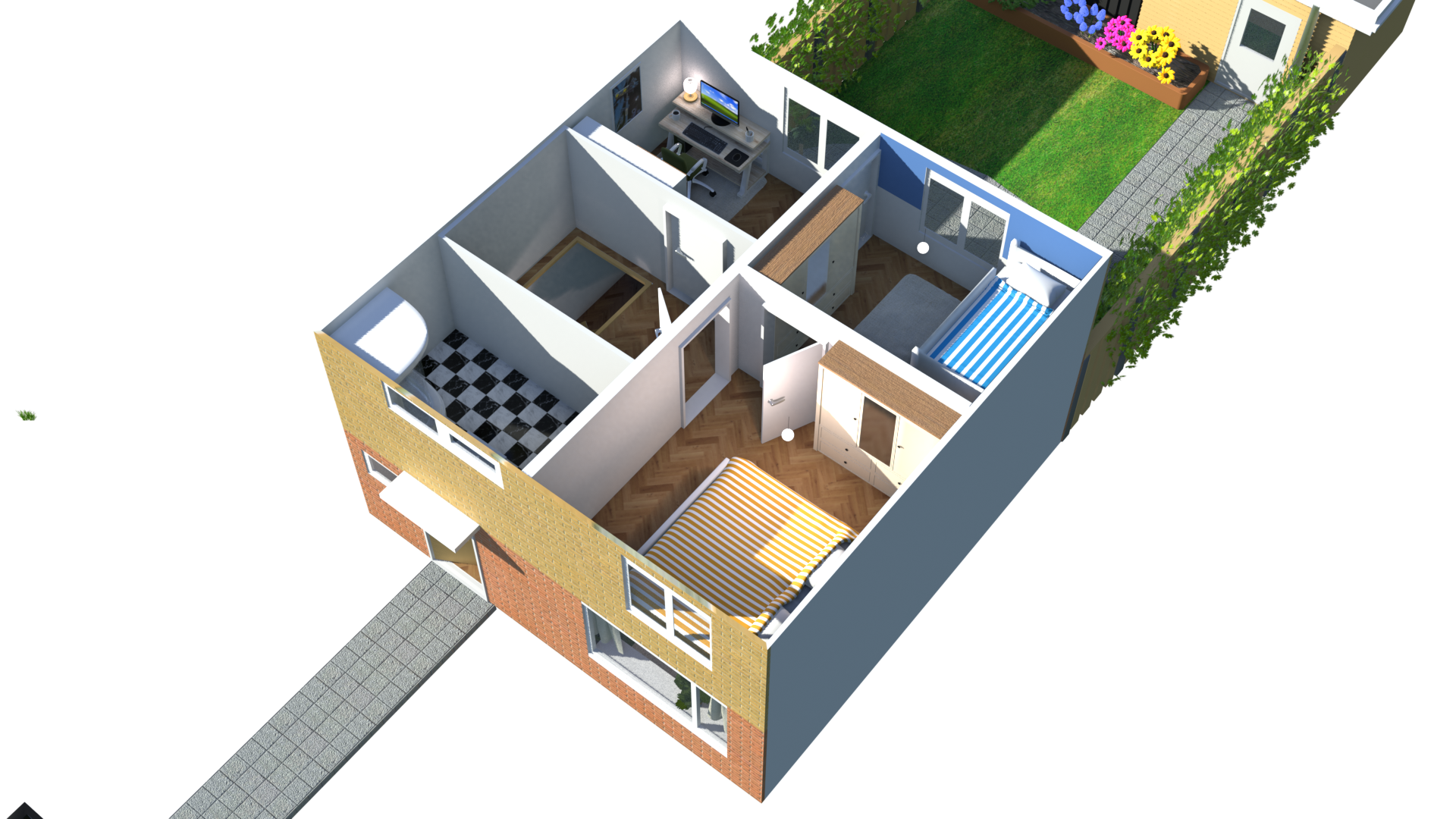 De renders zijn volledig in Blender gemaakt en bevatten een gedetailleerd gemodeleerd interieur, aanpasbare texturen en realistische ruimtes – alles zelf ontworpen en gemodelleerd.